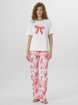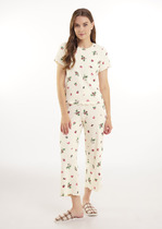 Горловина круглой формы с притачной обтачкой из основного полотна. Рукава длинные втачные. Перед и спинка цельнокроеные. Низ джемпера и рукавов обработан швом в подгибку. Брюки длинные, немного заужены к низу. Пояс цельнокроенный с эластичной тесьмой внутри. Низ брюк застрочен с эластичной тесьмой внутри.