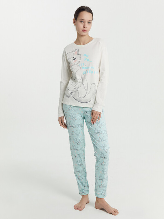 Горловина круглой формы с притачной обтачкой из основного полотна. Рукава длинные втачные. Перед и спинка цельнокроеные. Низ джемпера и рукавов обработан швом в подгибку. Брюки длинные, немного заужены к низу. Пояс цельнокроенный с эластичной тесьмой внутри. Низ брюк застрочен с эластичной тесьмой внутри.