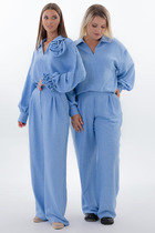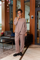 Брюки с посадкой на талии, прямого силуэта. Пояс цельнокроеный с резиной внутри. Низ брюк обработан швом в подгибку.
