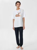 Комплект женский состоит из футболки и брюк. Футболка свободного силуэта. Горловина овальная с обтачкой из основного полотна. Нижний срез футболки и рукавов обработан швом вподгибку.