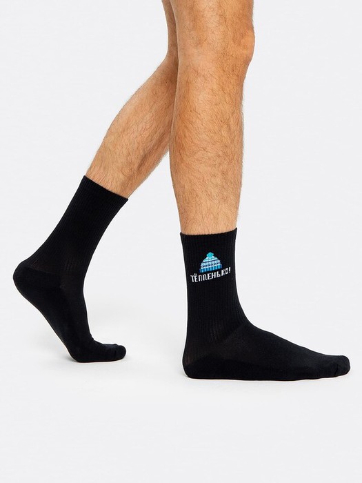 рис.2129  Мужской однотонный носок с высоким плотным бортом и махровой стопой, с рисунком в виде шапочки и надписи "Тепленько".