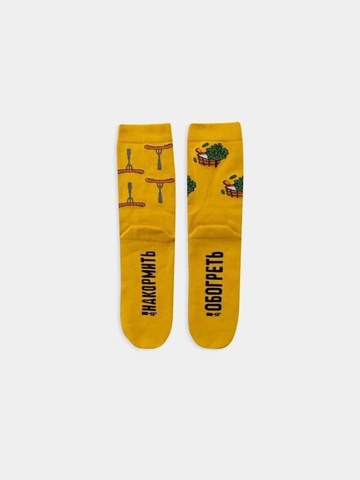 Яркие мужские носки классической длины с теплой махровой стопой. Забавный рисунок и слова "накормить" и "обогреть" – забавно и стильно! Состав: 2% эластан / 33% ПА / 65% хлопок.