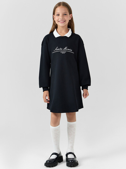 Платье свободного силуэта. Перед и спинка цельнокроеные. Горловина круглой формы c окантовкой из трикотажного полотна рибаны. В горловину втачан вязаный воротник, шов втачивания закрыт х/б тесьмой. Рукава длинные, втачные. Линия плеча спущена. По низу рукавов притачные манжеты из трикотажного полотна рибаны. Низ изделия фигурный, обработан на 2-х игольной