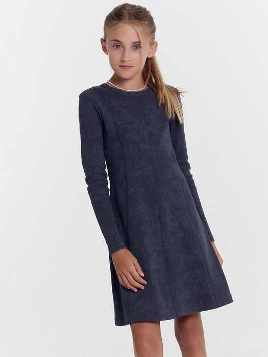 Платье для девочек прилегающего силуэта из трикотажного полотна рибана. Горловина круглой формы обтачка из основного полотна. На детали переда декоративные членения. Рукав втачной, длинный, узкий. Платье к низу расширяется. Низ изделия и руковов обработаны швом в подгибку.