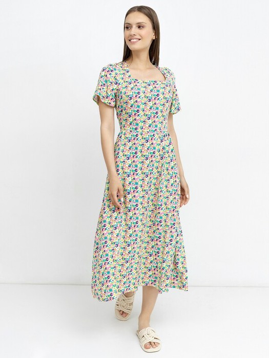 Текстильное платье полуприлегающего силуэта, отрезное по линии талии. Длина – ниже колена. Вырез горловины – «каре». Юбка спереди и по спинке имеет сборки по линии талии. Рукава у платья короткие, широкие, со сборкой в верхней части. В боковом шве обработана застежка на боковую молнию. Очаровательно!