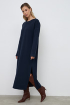 Текстильное платье мини женское полуприлегающего силуэта с фигурным низом. Перед с центральной застежкой на пуговицы. Горловина круглой формы с воротником-стойкой. Спереди и сзади заложены складки, подчеркивающие талию. Линия плеча спущена, длинные рукава заканчиваются широкими манжетами.
