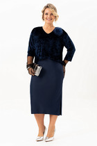 Платье полуприлегающего силуэта из ткани рошель. Горловина V-образной формы. Платье отрезное по талии, с эластичной тесьмой внутри. По эластичной тесьме проложены отделочные строчки. По детали переда средний шов. Детали спинки со средним швом. Рукав втачной, длинный. По окату слегка присборен. Длина рукава 3\4, по низу рукава настрочена эластичная тесьма которая делает сборку. Низ платья расширяется к низу. Длина платья ниже колена.