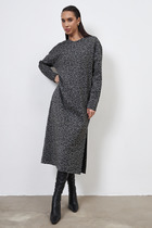 в чистый край. Горловина спинки более вырезана. Рукав втачной длинный, к низу рукав расширяется. Платье длиной выше колена.