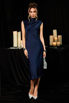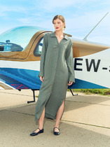 Платье прямое свободное, длиной миди. Горловина V-образной формы со стояче-отложным воротником. Плечо слегка спущено, рукав втачной, длинный. По низу рукавов отрезные манжеты с разрезами. Центральная застежка на петли и пуговицы. В боковых швах обработаны карманы. По бокам внизу обработаны разрезы. Нижний срез платья обработан швом вподгибку с закрытым срезом.