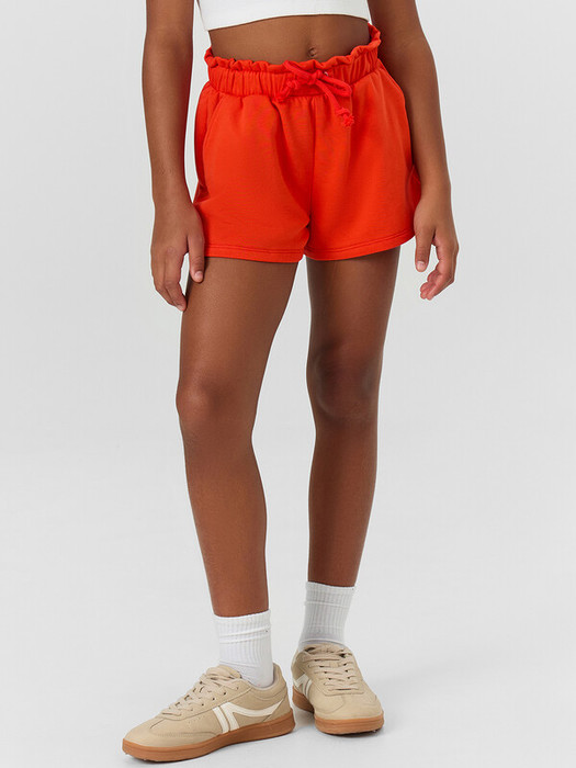 Короткие шорты для девочек прямого силуэта. Посадка средняя. Пояс отрезной с эластичной тесьмой и декоративным шнуром. По поясу выполнена декоративная строчка. На передних половинах обработаны карманы с наклонным входом от боковых швов. Низ шорт обработан швом в подгибку.
