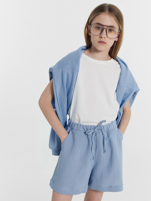 Шорты для девочек свободного силуэта из ткани. Посадка высокая. На детали переда карманы с отрезным бочком. Пояс отрезной с эластичной тесьмой RV40 внутри, на поясе пробиты петли и вставлен шнур из основного полотна. Шов втачивания пояса распошит. Длина выше колена. Низ обработан швом вподгибку с закрытым краем.