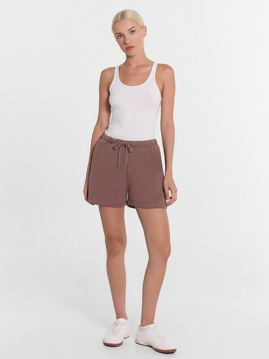 Мини-шорты свободного силуэта из легкого трикотажного футера. Высокая посадка на талии, эластичная тесьма в поясе, регулировочный шнурок-завязка и удобные боковые карманы – комфортный минимализм!