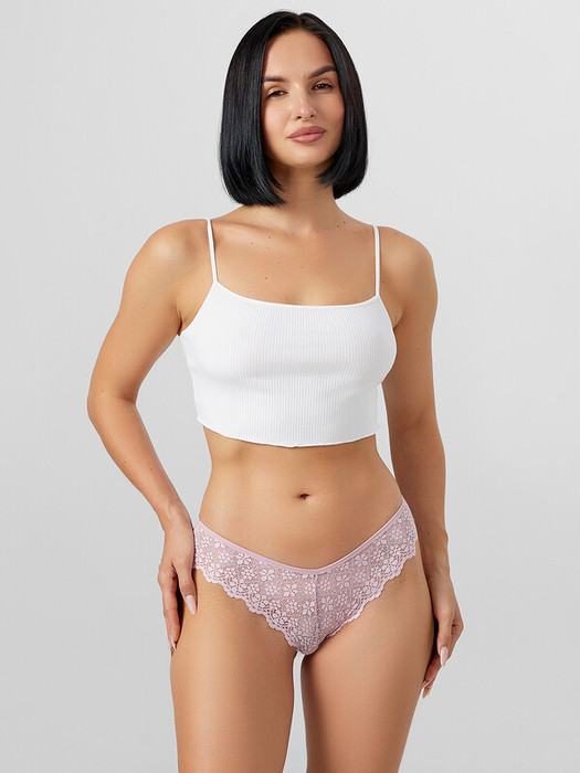 Изящные трусики-бразилиана — воплощение комфорта и утончённого стиля. Выполненные из эластичного кружева и мягкого кулирного полотна, они обеспечивают идеальную посадку благодаря средней высоте талии и V-образному силуэту. Передняя часть выполнена из кружева, добавляющего женственность, а задняя деталь из гладкого кулирного полотна со средним швом для дополнительного комфорта. Ластовица из натурального материала и аккуратная обработка нижних срезов швом вподгибку завершают этот элегантный образ.