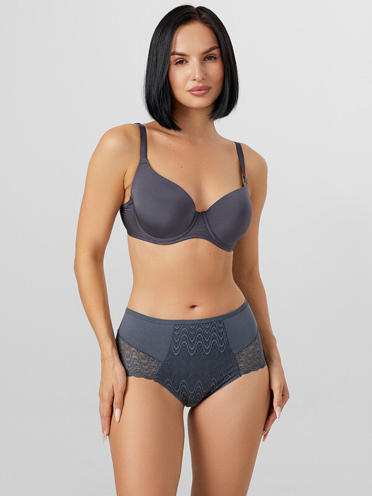 Передняя часть украшена кружевными вставками с вертикальным и горизонтальным членением, что добавляет образу изысканности. Задняя деталь со средним швом и декоративными линиями подчеркивает плавность изгибов. Все срезы обработаны мягкой эластичной тесьмой, которая предотвращает натирание и обеспечивает идеальную посадку. Ластовица на подкладке из основного материала гарантирует гигиеничность и дополнительный комфорт.