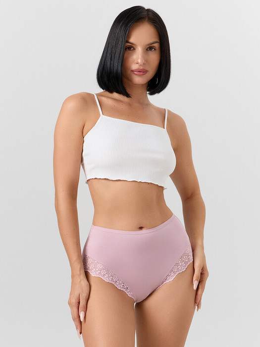 Передняя центральная деталь и задняя выполнены из кулирного полотна. Нижние  детали переда из широкого кружева, обработаны ширителем. Трусы с боковыми швами. Верхний срез трусов обработан эл. тесьмой 10мм (жилко    й WT4, Девсел арт 13460W) на плоскошовной машине с верхним застилом. Задняя деталь цельнокроеная. Боковые срезы ластовицы и нижние срезы задней детали обработаны эл. тесьмой  6 мм (жилкой WT4, Девсел арт 13460W), настрочена на плоскошовной машине с верхним застилом.