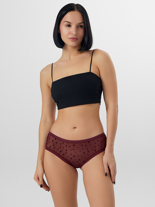 Трусы женские, силуэт - слипы, выполнены из триктажного полотна сетка с флоком. Верхние и нижние срезы обработы эл тесьмой 15мм (жилкой WT4-15, Девсел арт 13195W) на плоскошовной машине с верхним застилом. Задняя и передняя деталь цельнокроеные. Подкладка ластовицы отлетная по переду из кулирного полотна.