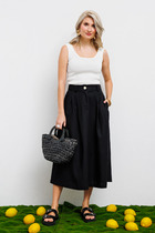 Юбка прямая, длина миди. Верхний срез обработан швом вподгибку с эластичной тесьмой внутри ( 40мм 40RV внутр.). На передней и задней детали проложена строчка по среднему шву. На задней детали в среднем шве обработан разрез. Нижний срез обработан швом вподгибку. Усилитель разреза- Лента репсовая шир.7мм, SFLR-2 .