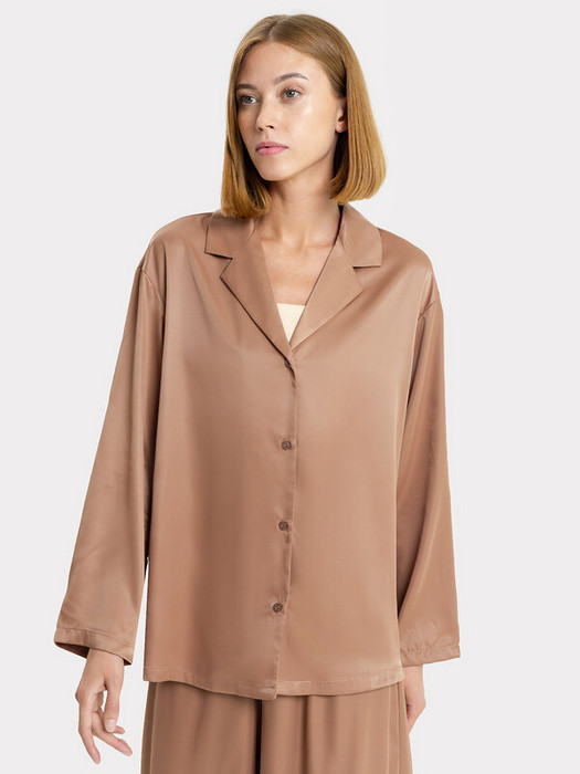 Силуэт прямой и свободный, рукава длинные втачные, линия плеча немного спущена. Центральная застежка на пуговицы, воротник отложной. Низ изделия и низ рукавов застрочен швом в подгибку.