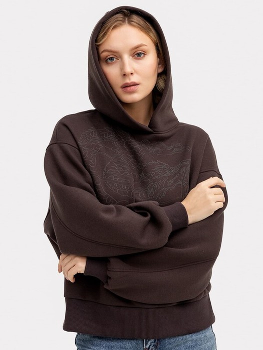 Женское худи силуэта оверсайз, выполненное из трикотажного футера с теплым и нежным подчесом.  Длина – до середины бедер. Рукава длинные и свободные, вырез круглый. Есть просторный капюшон. Спущенная линия плеча дарит особый комфорт. Рекомендуем для стильных утепленных образов!