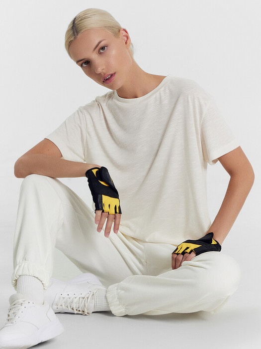 Нижний срез футболки и рукавов обработан швом вподгибку.