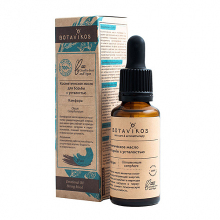 Ароматерапевтический эффект: эфирное масло, получаемое из древесины и корней камфорного дерева, обладает острым резким ароматом с лёгкими пряными оттенками, напоминающим запах эвкалипта. Камфорное масло является носителем умиротворяющей энергии, оно мягко расслабляет в периоды интенсивных нагрузок и переутомления, снимает психическую и физическую усталость. Облегчает состояние при головных болях и мигренях, вызванных изнурительным стрессовым режимом.