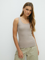 Женская майка в рубчик с вареным эффектом и декором из страз, круглым вырезом и широкими бретелями.
