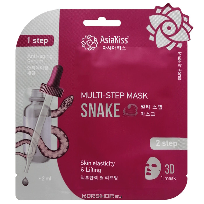 Мультишаговая 3D маска со змеиным ядом от торговой марки Asia Kiss – это замечательное омолаживающее средство. Благодаря инновационному пептиду Syn-Ake лицевые мышцы расслабляются, и лицу визуально кажется более гладким. Средство наносится в 2 этапа. Сначала необходимо воспользоваться питательной сывороткой, благодаря которой кожа становится более эластичной и увлажненной. После впитывания приложите маску к лицу и оставьте на 15-20 минут. Купить мультишаговую 3D маску со змеиным ядом Asia Kiss с доставкой на дом по Москве и Подмосковью можно в интернет-магазине KorShop.ru.