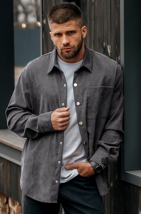 Мужская темно-серая рубашка из мягкого вельвета – отличный способ подчеркнуть свою индивидуальность. Свободный крой подарит уют и комфорт, а карман на груди и застежка на металлические кнопки добавят стильную изюминку в образ. Однотонная вельветовая рубашка с удлиненной спинкой идеальна для прохладной весны и зябкой осени.
