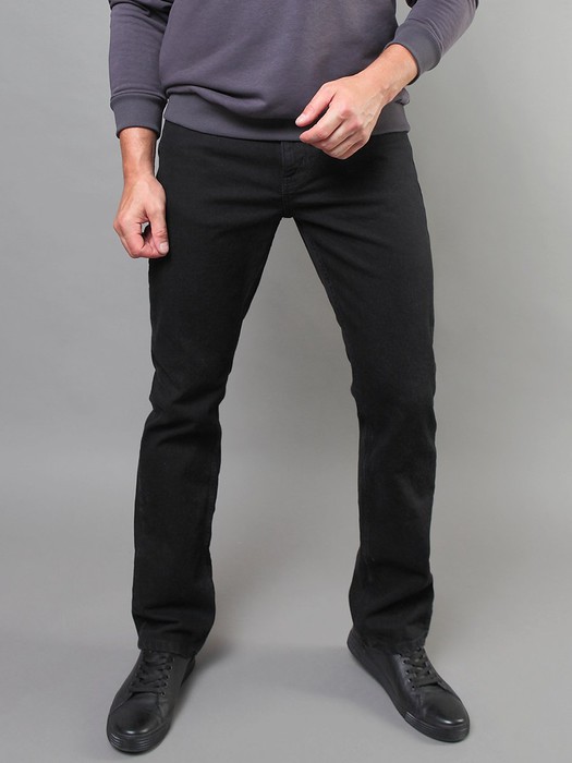 Мужские классические джинсы с пятью карманами. Посадка Slim fit (облегающие по бедру), средняя высота талии. Застежка на молнии. Немного зауженные к низу. Выполнены из слабоэластичной ткани denim comfort stretch, цвет ткани Black/Black (лицевая и изнаночная стороны ткани черные). Классическая темная стирка с потёртостями только по швам. Параметры указаны для размера 32. Длина внутреннего шва - 86,0 см.