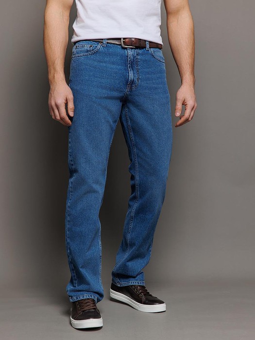 Мужские классические джинсы с пятью карманами. Эта модель выпускактся уже более 25-ти лет и все годы пользуется неизменной популярностью у наших покупателей. Посадка Regular fit (полуоблегающие по бедру), высокая талия, немного заужены к низу. Застежка на молнии. Выполнены из традиционной хлопковой ткани denim. Классическая темная стирка "stone wash".
