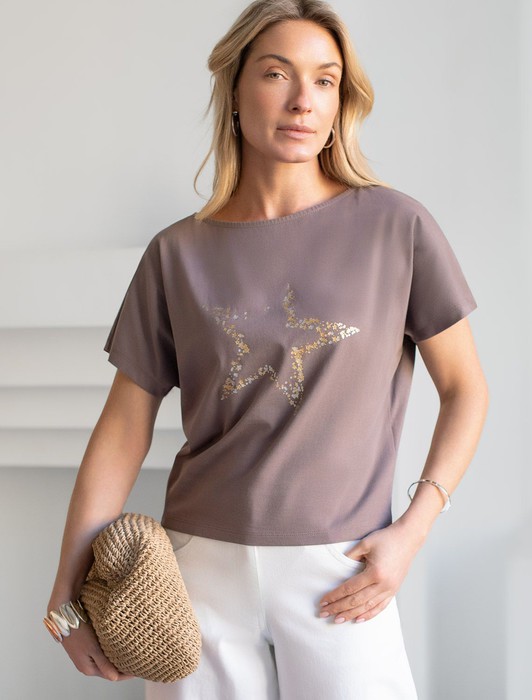 Состав: 92%Хлопок 8%ПУ Плотность: 150 Г/м2Футболка кофейного цвета идеально подходит для вечеринки и создания яркого образа. Оригинальный принт из блестящей фольги в виде звезды придает изделию шикарный вид, который привлечет внимание на любом мероприятии. Модель с вырезом лодочка и цельнокроеным рукавом обеспечивает свободу движений и комфорт в носке. Такой фасон изделия подходит на большие размеры, гармонично сидит на фигуре и помогает создать легкий акцент на достоинствах. Благодаря особенностям кроя с цельнокроеным рукавом удается искусно скроет любые возможные недостатки в области плеч и рук, обеспечивая комфортное прилегание без ощущения скованности. Аккуратный вырез лодочка красиво подчеркивает шею и делает образ элегантным, сохраняя актуальность для разных случаев — от рабочих встреч до вечерних прогулок и праздничных мероприятий.