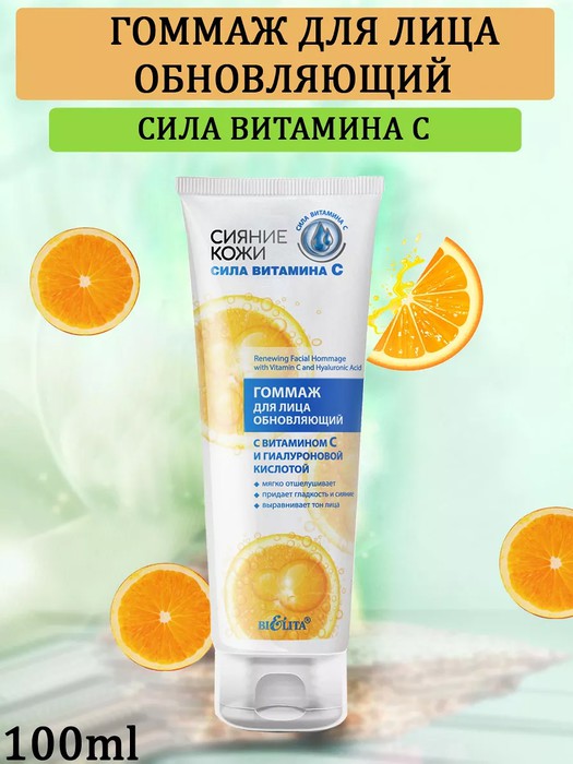 Гоммаж для лица обновляющий с витамином С и гиалуроновой кислотой Гоммаж для лица деликатно очищает кожу, удаляя отмершие клетки эпидермиса. В процессе мягкого массажа впитываются все загрязнения, избыток кожного жира и остатки макияжа.