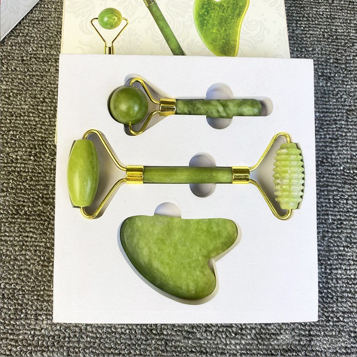 Высококачественный массажный набор с роллером и скребком Гуаша изготовлен из натурального нефрита.Так же в комплекте идёт скребок Гуаша, благодаря его форме пластину можно использовать не только для лица, но и для тела. Массажёры отлично можно совмещать с увлажняющими и уходовыми средствами, которые, благодаря массажу воздействуют на кожу в несколько раз эффективнее.Основные задачи такого массажёра — расслабить мышцы, улучшить кровообращение и лимфодренаж. На лице такой эффект обеспечивается несильным надавливанием на кожу во время проведения устройства по массажным линиям. Действие механического давления должно снять отёчность, улучшить цвет лица и даже убрать мелкие морщинки. Для снятия отечности используйте холодные массажеры. Используют массажёр не только на лице, но и на конечностях, спине и ягодицах, хотя, конечно, придётся прибегнуть к посторонней помощи во время процедуры. В этих участках мышцы прогреваются и расслабляются с помощью всё того же разминания.Воздействие массажёром на рефлексогенные зоны и зоны Захарьина-Геда позволяет опосредованно воздействовать на многие внутренние органы, позволяя лечить их внутренними резервами организма. Под последними подразумевается выработка гормонов и иных биологически активных веществ, которые направляются напрямую в больное место и способствуют его скорейшему выздоровлению.Зоны Захарьина-Геда — области на коже, которые посредством нервной и эндокринной системы связаны с определённым внутренним органом. Рефлексогенные зоны — это участки на теле, раздражение которых вызывает безусловные рефлексы, например, чихание после прикосновения к слизистой носа, и ответную реакцию конкретных внутренних органов.