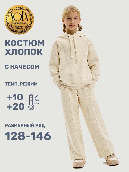 Костюм СКАНДИНАВИЯ из петельного хлопкового футера с легким начесом, состоит из широких брюк палаццо и свободного худи. Футер этого костюма с гладкой поверхностью и мягкой изнанкой, наличие в составе футера шерсти делает изделие более теплым, а вискозы и эластана - увеличивают срок износостойкости. При эксплуатации костюм почти не мнется и сохраняет свой внешний вид спустя много стирок.Худи свободного силуэта, с объемным капюшоном, карманами.  Манжеты и пояс из трикотажного полотна «кашкорсе». Модные широкие брюки с классической простроченной стрелкой, с боковыми карманами. Пояс из трикотажного полотна «кашкорсе», с резинкой и со шнуром для дополнительной регулировки объема по талии.Комплект можно носить в качестве самостоятельной одежды при t° от +10°С до +20°С, а также в качестве второго слоя под верхнюю одежду.Прекрасный вариант для прогулок и активного отдыха, в поездках просто незаменим. Комплект станет любимой вещью в гардеробе вашего ребенка.