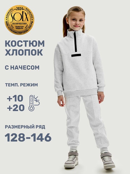 Костюм СТРИТ из плотного хлопкового трикотажа с мягким стриженным начесом внутри. Состоит из двух предметов — анорака и брюк. Анорак свободного силуэта, с воротником-стойкой на молнии. Манжеты и пояс из трикотажного полотна «кашкорсе». Брюки свободного силуэта, зауженные к низу, с боковыми карманами, с трикотажными манжетами. Пояс с резинкой и со шнуром для дополнительной регулировки объема по талии. Пояс и манжеты из трикотажного полотна «кашкорсе».Комплект можно носить в качестве самостоятельной одежды при t° от +10°С до +20°С, а также в качестве второго слоя под верхнюю одежду.Прекрасный вариант для прогулок и активного отдыха, в поездках просто незаменим. Комплект станет любимой вещью в гардеробе вашего ребенка. Рекомендуется предварительная стирка для удаления лишнего ворса с изделия.