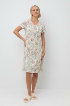 Сорочка из гладкокрашеного вискозного трикотажного полотна, слегка расширенная книзу, с короткими втачными рукавами. Полочка и спинка – с V – образными кружевными деталями по горловине.