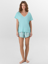 Сорочка женская из трикотажного полотна «кулирка» с набивным рисунком, расширенная книзу, без рукавов, с расширенной, углубленной горловиной овальной формы и притачной кокеткой по переду. Срезы пройм и горловины, а также шов притачивания кокетки, обработаны фасонной эластичной тесьмой с кружевным краем. Низ изделия обработан узкой обметочной строчкой.