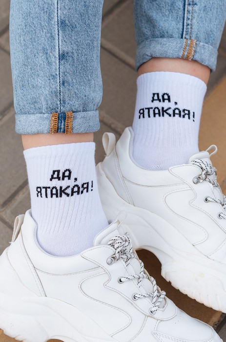 Прикольные женские носки с надписью Да, я такая – идеальный способ разнообразить быт и добавить в него крутую изюминку! Классный рисунок поднимет настроение и разбавит серые будни. Белые носки для женщин и мужчин выполнены из нежного хлопка, подойдут также для подростков.