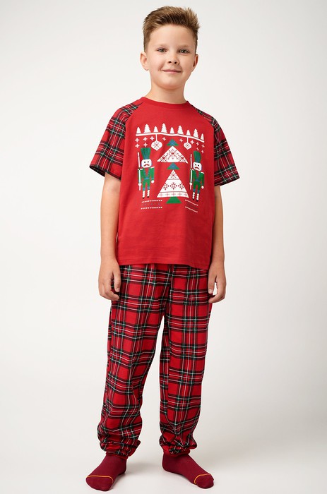 Новогодняя пижама для мальчиков и подростков выполнена из 100% хлопка. Красная футболка с праздничным принтом и брюки в клеточку с манжетами на штанинах делают домашний комплект удобным для сна, садика и семейных фотосессий.