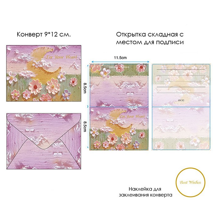 Открытка дополнена белым конвертом с наклейкой и упакована в индивидуальный прозрачный пакетик.Внутри есть место для того, чтобы вы написали пожелание.