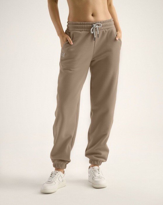 Джоггеры свободного кроя с боковыми карманами, собранные внизу. Широкий эластичный пояс со шнуром.