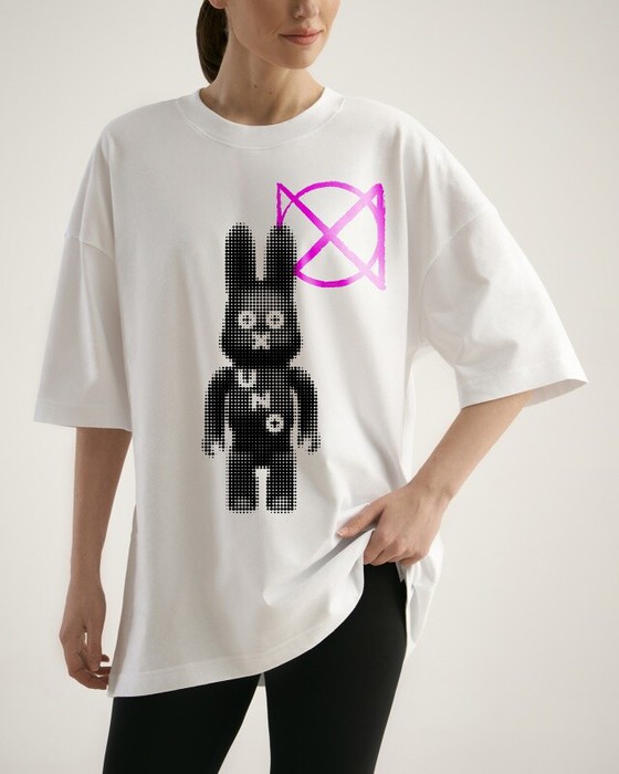 Футболка свободного силуэта. Спущенное плечо. Горловина из двух деталей, из рибаны.