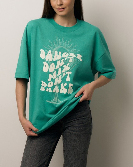 Футболка свободного силуэта. Спущенное плечо. Горловина из двух деталей, из рибаны.
