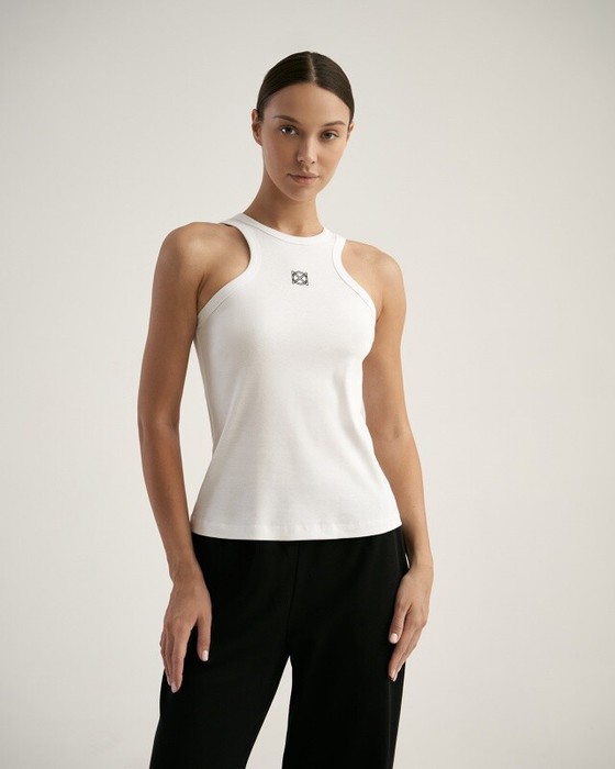Майка из рибаны. Фигурная пройма. Горловина и проймы окантованы.