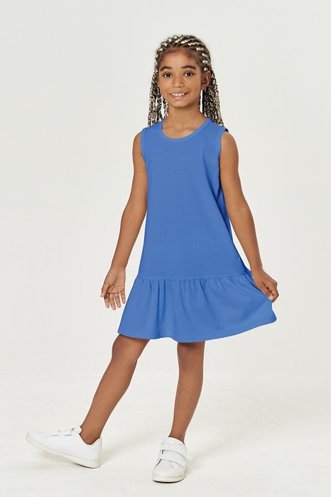 Платье для девочек. Свободного силуэта, отрезное по низу, с оборкой. Горловина и проймы окантованы бейкой из рибаны.