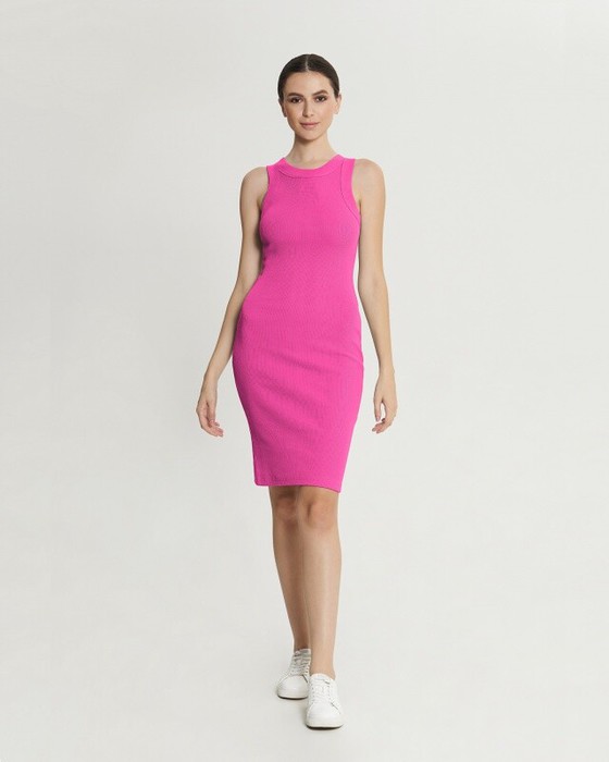 Платье средней длины из кашкорсе, облегающего силуэта, с широкой окантовкой пройм и горловины из рибаны.