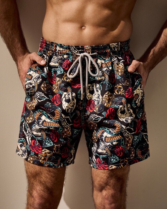 Плавательные шорты. Карманы в боковых швах. Задний карман с клапаном на правой задней половинке шорт. Пояс цельнокроенный, отстроченный, внутри с резинкой и шнурком.