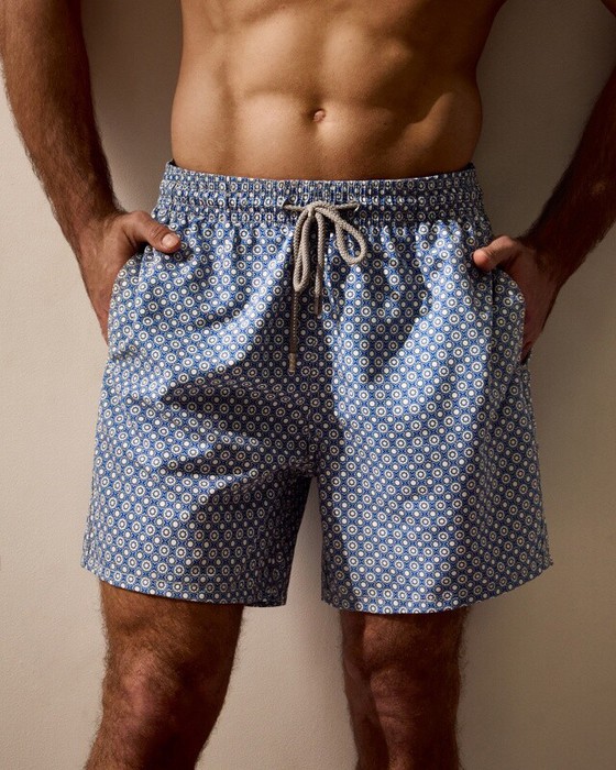 Плавательные шорты. Карманы в боковых швах. Задний карман с клапаном на правой задней половинке шорт. Пояс цельнокроенный, отстроченный, внутри с резинкой и шнурком.