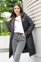 Женственное и элегантное утепленное пальто из комбинированной ткани. Полуприлегающий силуэт создан рельефами из горловины на передней части и спинке. Центральная застежка на молнию, закрытую планкой с кнопками. Карманы в рельефном шве на потайных молниях. Воротник-стойка. Рукав втачной двухшовный, длина 64 см, низ рукава можно загибать, регулируя длину. Длина изделия по спинке 85 см. Утеплитель холкон (см.описание), плотность 200, в рукавах 150.