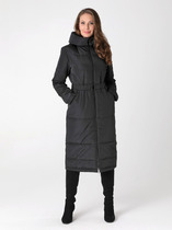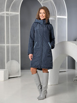 Женственное и элегантное утепленное пальто из комбинированной ткани. Полуприлегающий силуэт создан рельефами из горловины на передней части и спинке. Центральная застежка на молнию, закрытую планкой с кнопками. Карманы в рельефном шве на потайных молниях. Воротник-стойка. Рукав втачной двухшовный, длина 64 см, низ рукава можно загибать, регулируя длину. Длина изделия по спинке 85 см. Утеплитель холкон (см.описание), плотность 200, в рукавах 150.